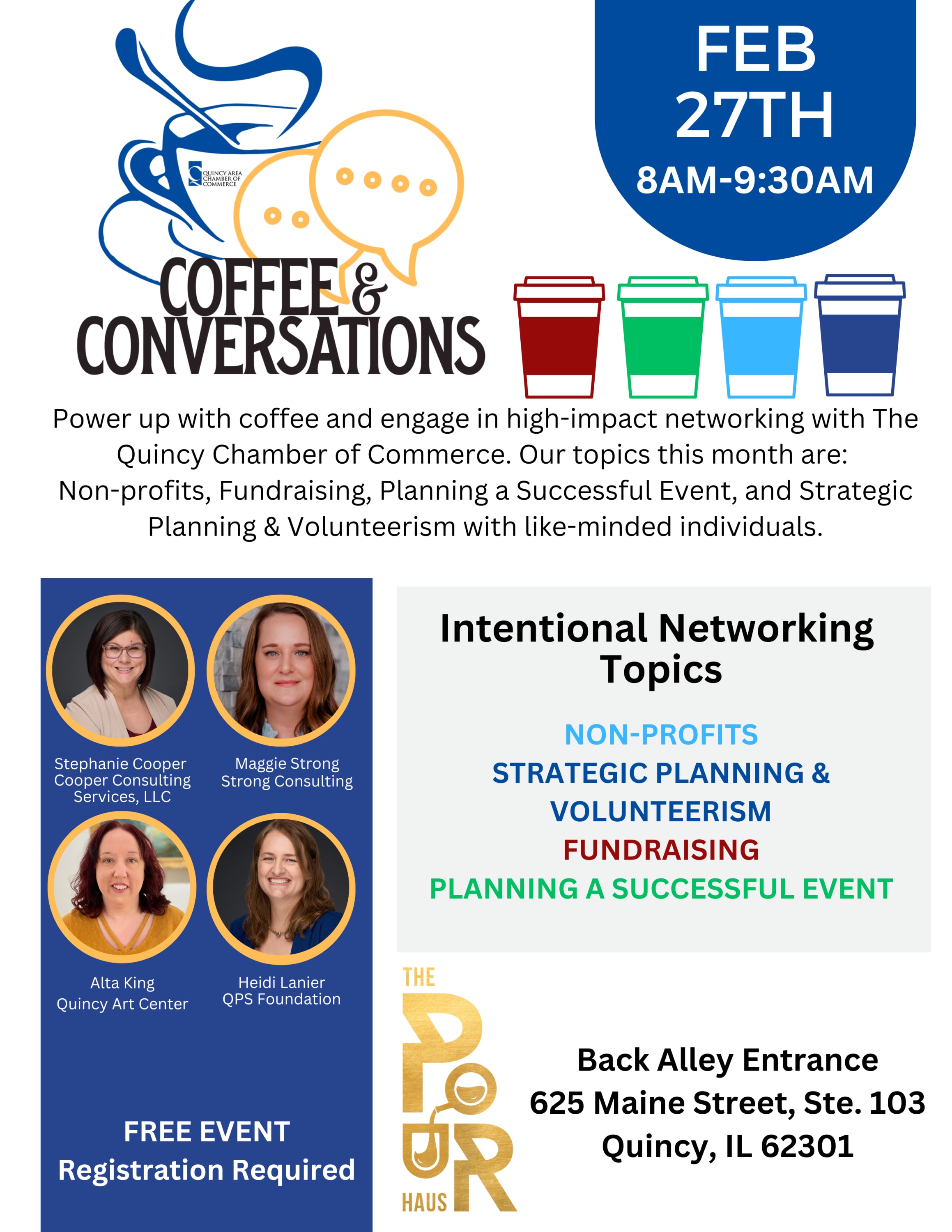 Power up with coffee and engage in high-impact networking with The Quincy Chamber of Commerce. Our topics this month are: Non-profits, Fundraising, Planning a Successful Event, and Strategic Planning & Volunteerism with like-minded individuals.