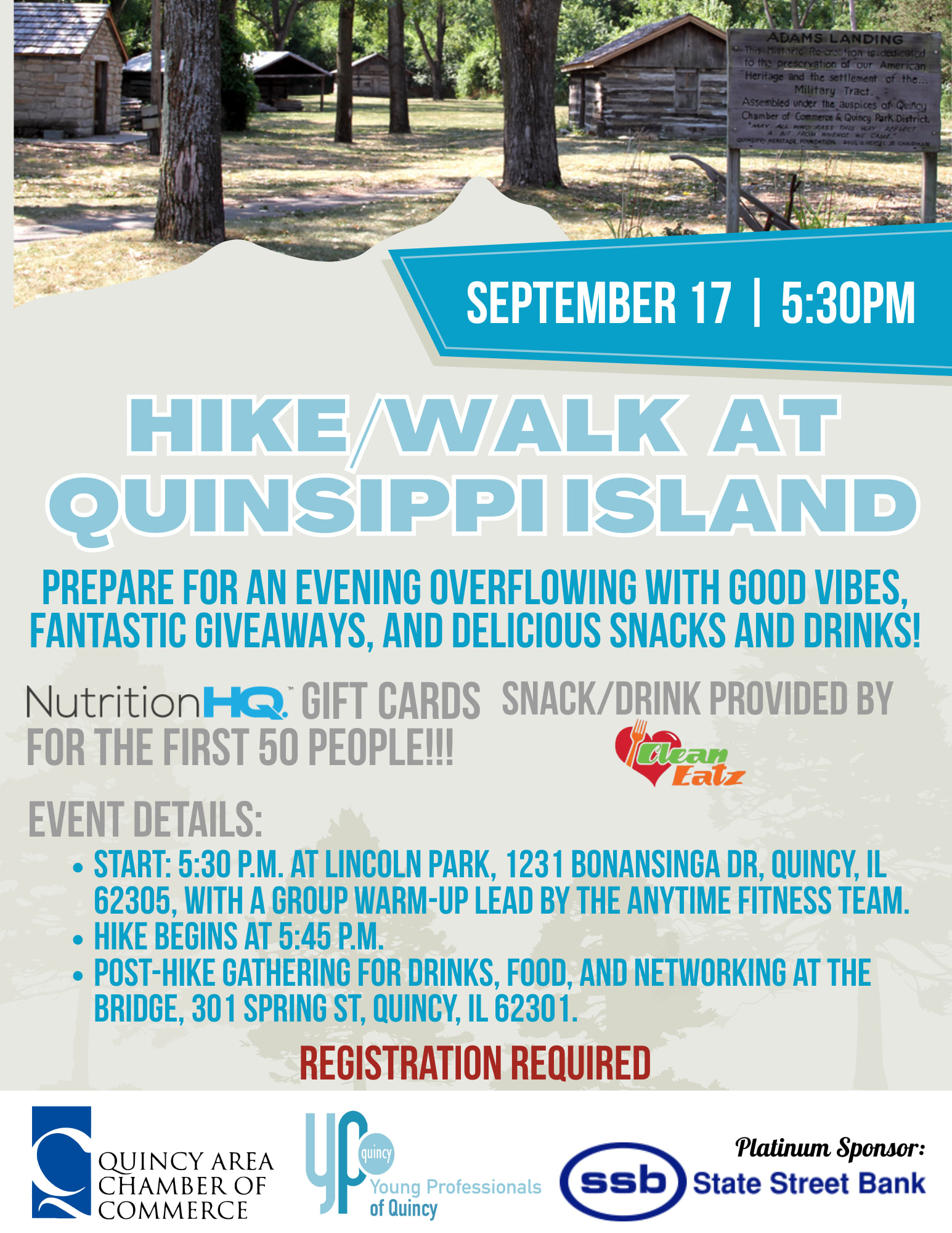 - Post-hike gathering for drinks, food, and networking at The Bridge, 301 Spring St, Quincy, IL 62301.