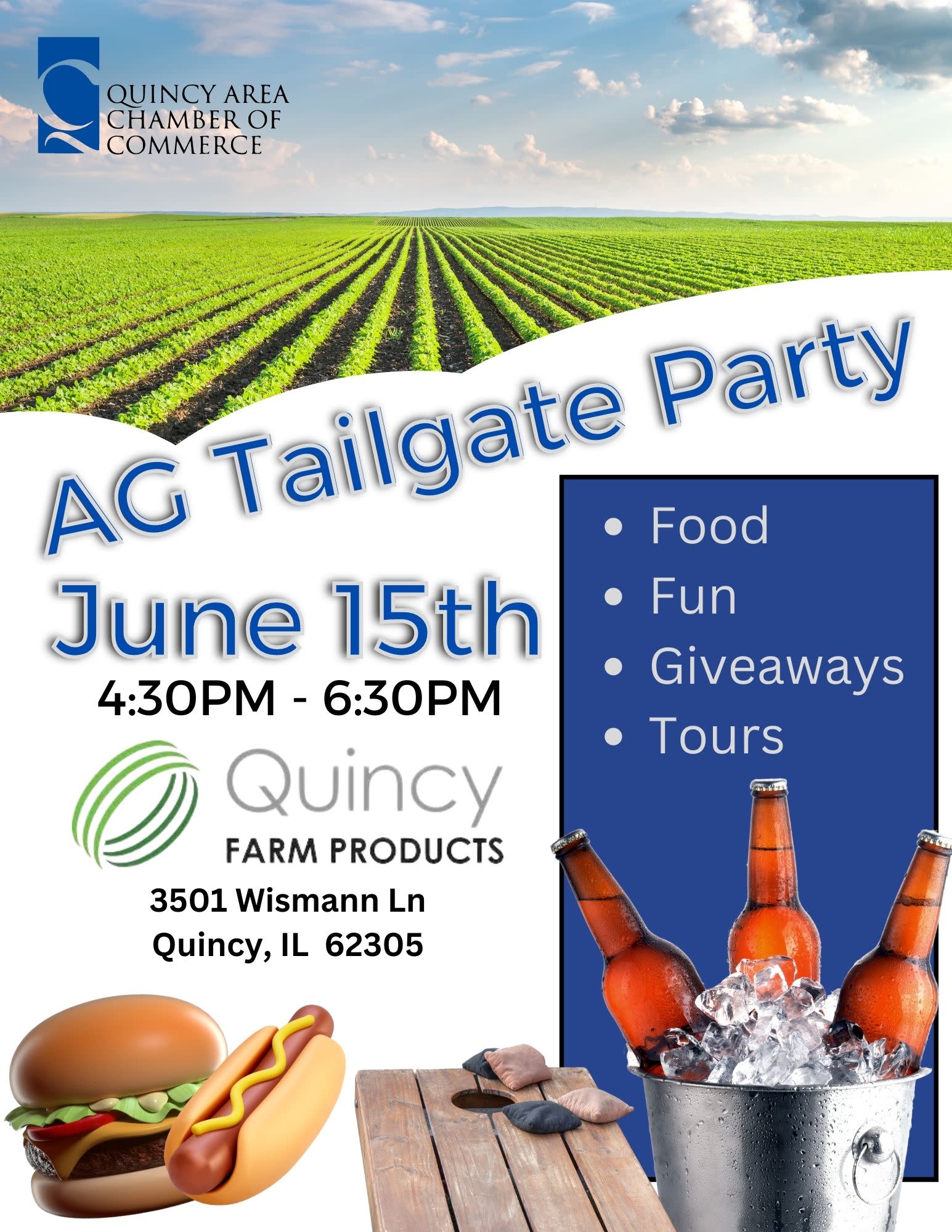 Join us for a fun-filled evening with the Ag community. Come and enjoy some food, fun and activities provided by Quincy Farm Products.Images