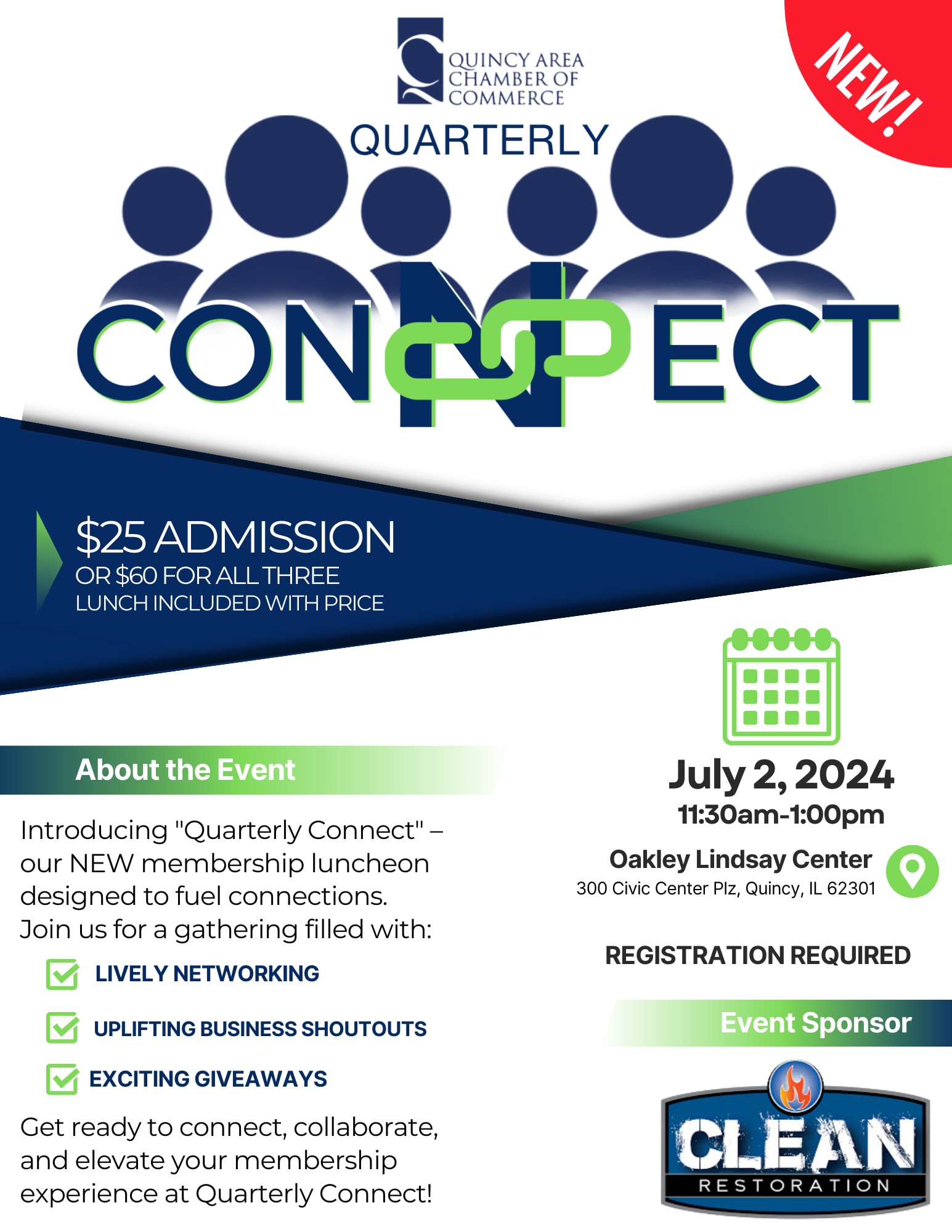 Designed to fuel connections. Join us for a gathering filled with lively networking, uplifting business shoutouts, and exciting giveaways. Get ready to connect, collaborate, and elevate your membership experience at Quarterly Connect! This Quarters Connect is being sponsored by CLEAN Restoration