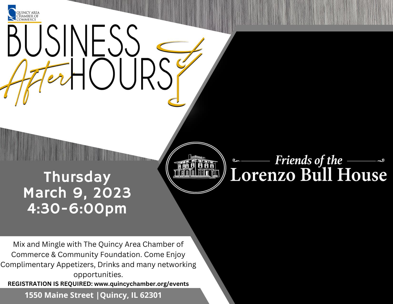 Come join us for the Business After Hours at Friends of Lorenzo Bull House. Gather your business cards and join us for networking, appetizers, drinks and prizes. Reservations required for all 2023 Business After Hours!