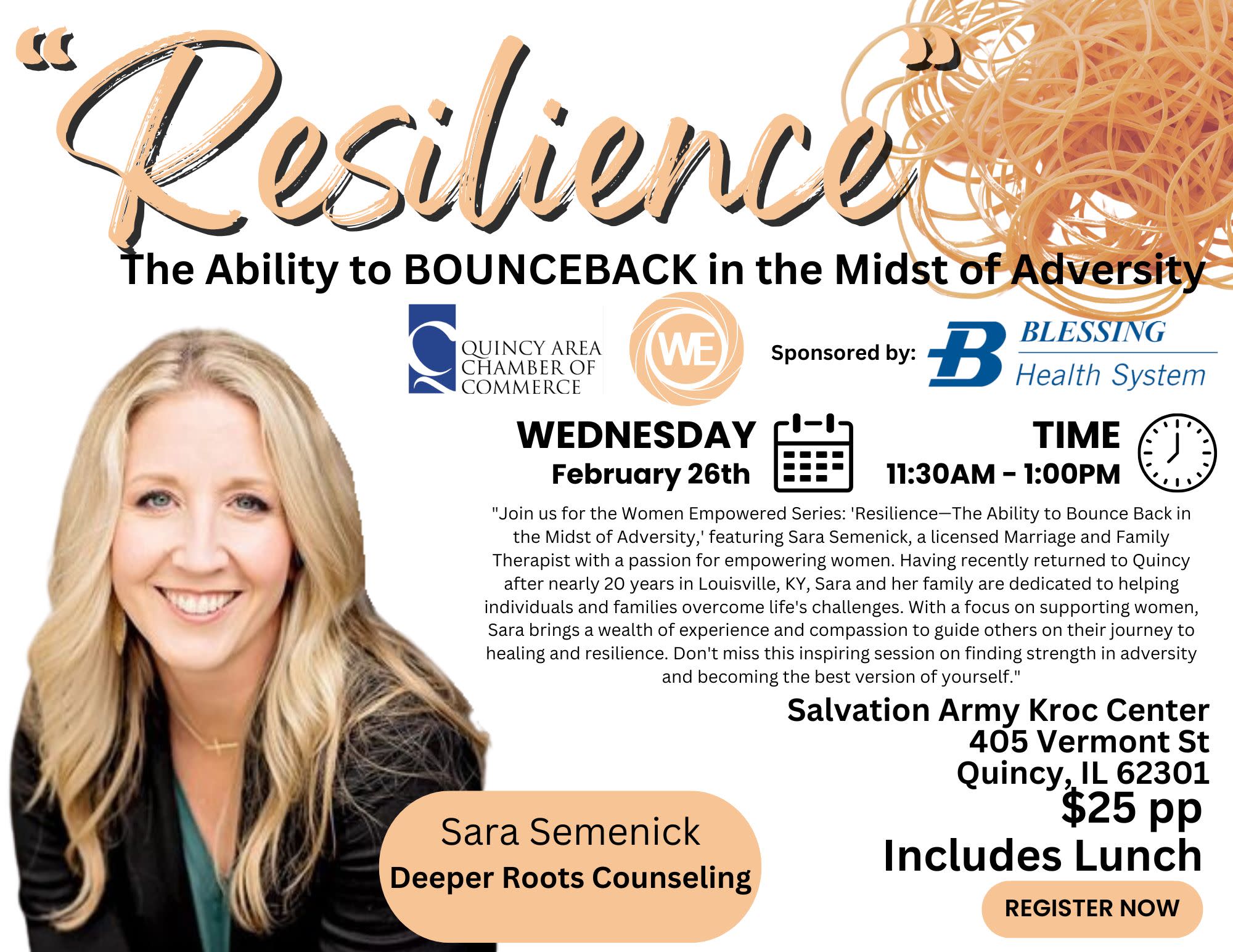 "Join us for the Women Empowered Series: 'Resilience—The Ability to Bounce Back in the Midst of Adversity,' featuring Sara Semenick, a licensed Marriage and Family Therapist with a passion for empowering women. Having recently returned to Quincy after nearly 20 years in Louisville, KY, Sara and her family are dedicated to helping individuals and families overcome life's challenges. With a focus on supporting women, Sara brings a wealth of experience and compassion to guide others on their journey to healing and resilience. Don't miss this inspiring session on finding strength in adversity and becoming the best version of yourself."